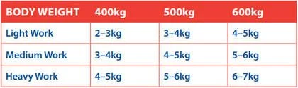 The above table is a guide only and the amount fed should be adjusted according to the horse’s age, temperament, condition, body weight and workload.